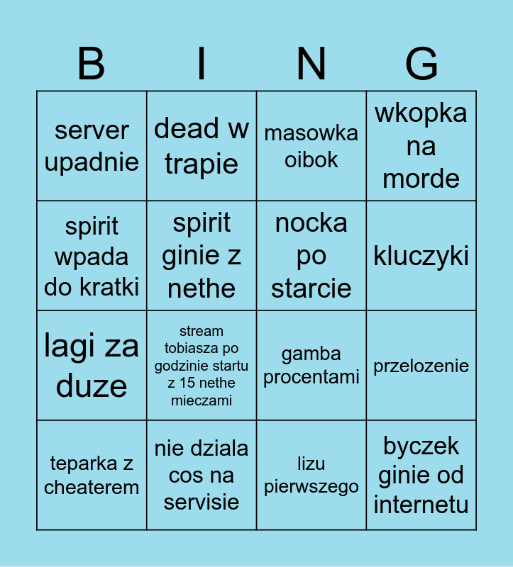 This bingo card has 20 words: przelozenie, za duzo osob SZOK, masowka oibok, cheaterzy obok, teparka z cheaterem, spirit wpada do kratki, nie dziala cos na servisie, server upadnie, lagi za duze, dead w trapie, stream tobiasza po godzinie startu z 15 nethe mieczami, gamba procentami, spirit ginie z nethe, byczek ginie od internetu, nocka po starcie, staty na minusie po starcie, kluczyki, wkopka na morde, lizu pierwszego and giniemy w trapie.