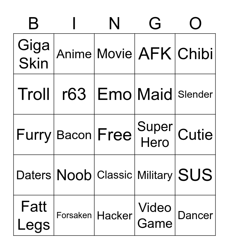 This bingo card has a free space and 24 words: Noob, Forsaken, Emo, Fatt Legs, Chibi, Giga Skin, Troll, Anime, Super Hero, Classic, Maid, Furry, Military, SUS, r63, Video Game, Cutie, Movie, Slender, Bacon, Dancer, Daters, AFK and Hacker.