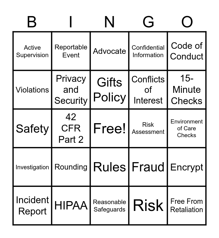 This bingo card has a free space and 34 words: Duty to Report, Risk, Compliance Hotline, Ethics, Investigation, Privacy and Security, Code of Conduct, Incident Report, Reportable Event, iSpring Trainings, Gifts Policy, Advocate, Undue Familiarity, Mitigate, Risk Assessment, 15-Minute Checks, HIPAA, Safety, Rounding, Fraud, Rules, Standards, Active Supervision, Environment of Care Checks, Reasonable Safeguards, Free From Retaliation, Confidential Information, Workplace Integrity, Conflicts of Interest, Violations, Chief Compliance Officer, 42 CFR Part 2, Encrypt and Authorization.