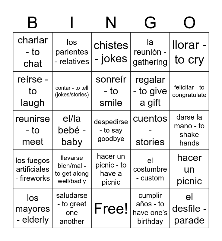 This bingo card has 31 words: Free!, abrazarse - to hug each other, el/la bebé - baby, besarse - to kiss each other, charlar - to chat, chistes - jokes, contar - to tell (jokes/stories), el costumbre - custom, cuentos - stories, cumplir años - to have one’s birthday, darse la mano - to shake hands, despedirse - to say goodbye, el desfile - parade, enorme - enormous, felicitar - to congratulate, fiesta de sorpresa - surprise party, hacer un picnic, llevarse bien/mal - to get along well/badly, los fuegos artificiales - fireworks, hacer un picnic - to have a picnic, llorar - to cry, nacer - to be born, los mayores - elderly, los parientes - relatives, regalar - to give a gift, reírse - to laugh, la reunión - gathering, reunirse - to meet, saludarse - to greet one another, sonreír - to smile and soplar las velas - to blow out the candles.