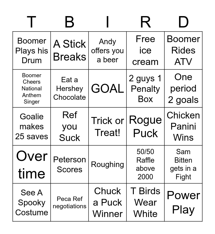 This bingo card has a free space and 24 words: Peterson Scores, Peca Ref negotiations, GOAL, See A Spooky Costume, Boomer Rides ATV, Boomer Plays his Drum, Boomer Cheers National Anthem Singer, A Stick Breaks, Rogue Puck, Roughing, 2 guys 1 Penalty Box, Goalie makes 25 saves, 50/50 Raffle above 2000, Sam Bitten gets in a Fight, Eat a Hershey Chocolate, T Birds Wear White, Chicken Panini Wins, Andy offers you a beer, One period 2 goals, Ref you Suck, Power Play, Over time, Free ice cream and Chuck a Puck Winner.