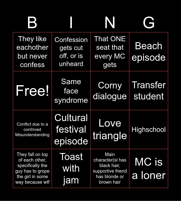 This bingo card has 16 words: Toast with jam, Highschool, That ONE seat that every MC gets, They like eachother but never confess, Conflict due to a contrived Misunderstanding, Confession gets cut off, or is unheard, Love triangle, Main character(sl has black hair, supportive friend has blonde or brown hair, Free!, Same face syndrome, They fall on top of each other, specifically the guy has to grope the girl in some way because wtf, Beach episode, Cultural festival episode, Transfer student, Corny dialogue and MC is a loner.