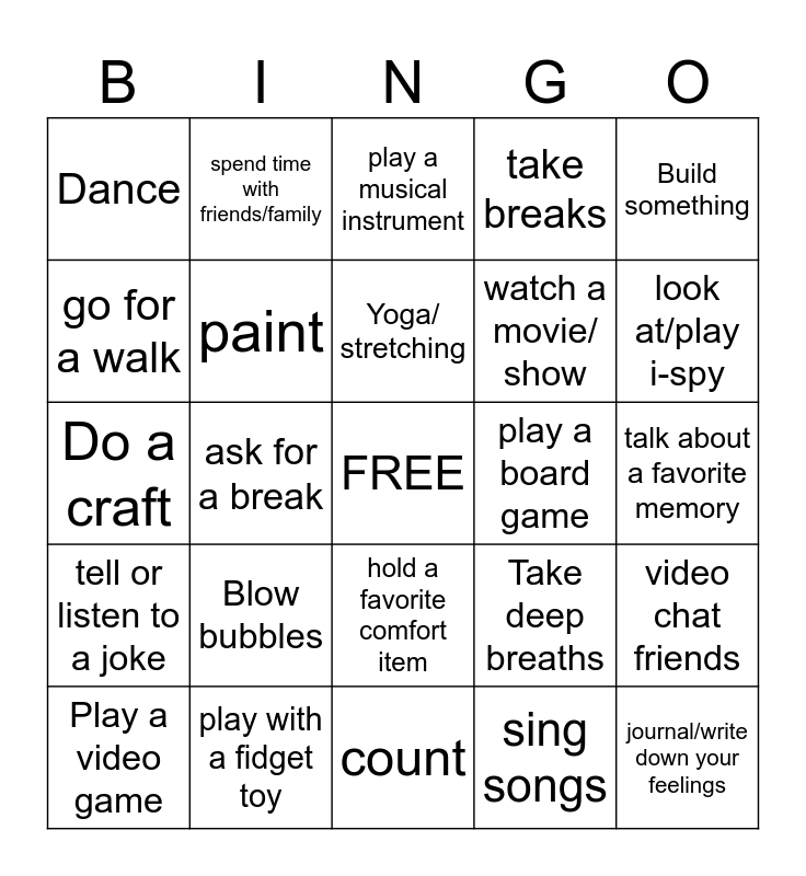 This bingo card has a free space and 24 words: Blow bubbles, play with a fidget toy, Yoga/ stretching, Play a video game, Build something, Dance, go for a walk, spend time with friends/family, play a board game, hold a favorite comfort item, watch a movie/ show, Do a craft, Take deep breaths, video chat friends, paint, sing songs, talk about a favorite memory, play a musical instrument, look at/play i-spy, ask for a break, journal/write down your feelings, tell or listen to a joke, take breaks and count.