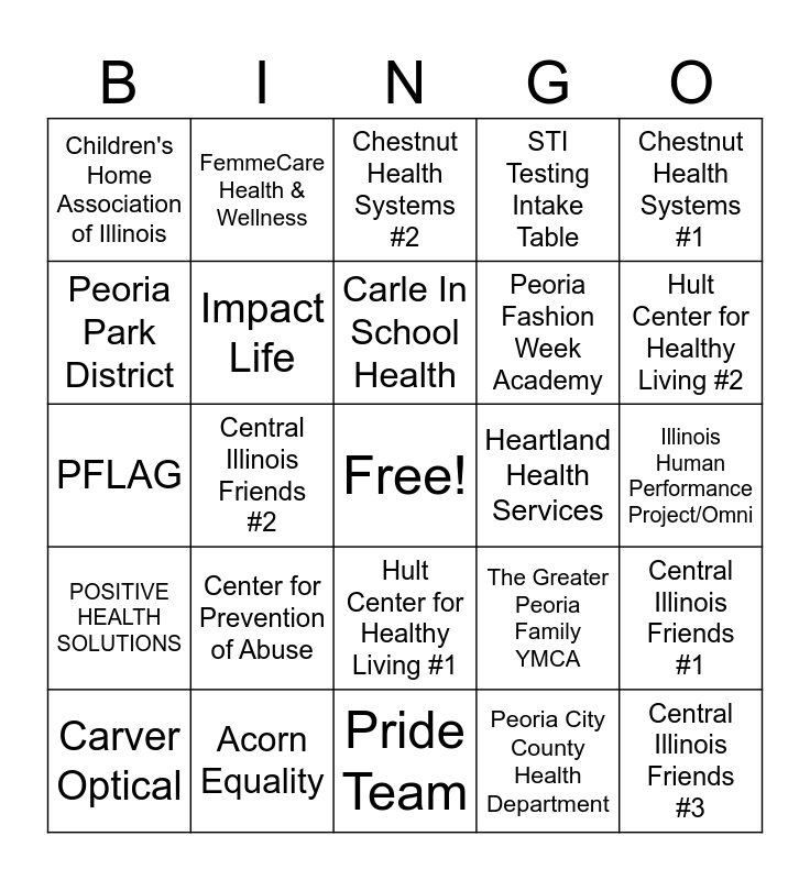 This bingo card has a free space and 24 words: Center for Prevention of Abuse, Acorn Equality, Carle In School Health, Carver Optical, Chestnut Health Systems #1, Children's Home Association of Illinois, Peoria Park District, FemmeCare Health & Wellness, Heartland Health Services, Hult Center for Healthy Living #1, Peoria Fashion Week Academy, PFLAG, The Greater Peoria Family YMCA, Central Illinois Friends #1, Impact Life, Peoria City County Health Department, Illinois Human Performance Project/Omni, Chestnut Health Systems #2, Hult Center for Healthy Living #2, Central Illinois Friends #2, Central Illinois Friends #3, POSITIVE HEALTH SOLUTIONS, STI Testing Intake Table and Pride Team.