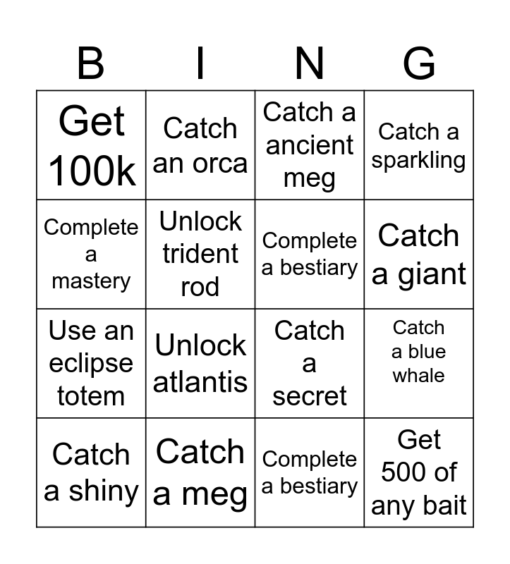 This bingo card has 16 words: Catch a shiny, Catch a meg, Catch a ancient meg, Catch a sparkling, Complete a mastery, Catch an orca, Catch a secret, Catch a blue whale, Get 100k, Unlock trident rod, Complete a bestiary, Catch a giant, Use an eclipse totem, Unlock atlantis, Complete a bestiary and Get 500 of any bait.