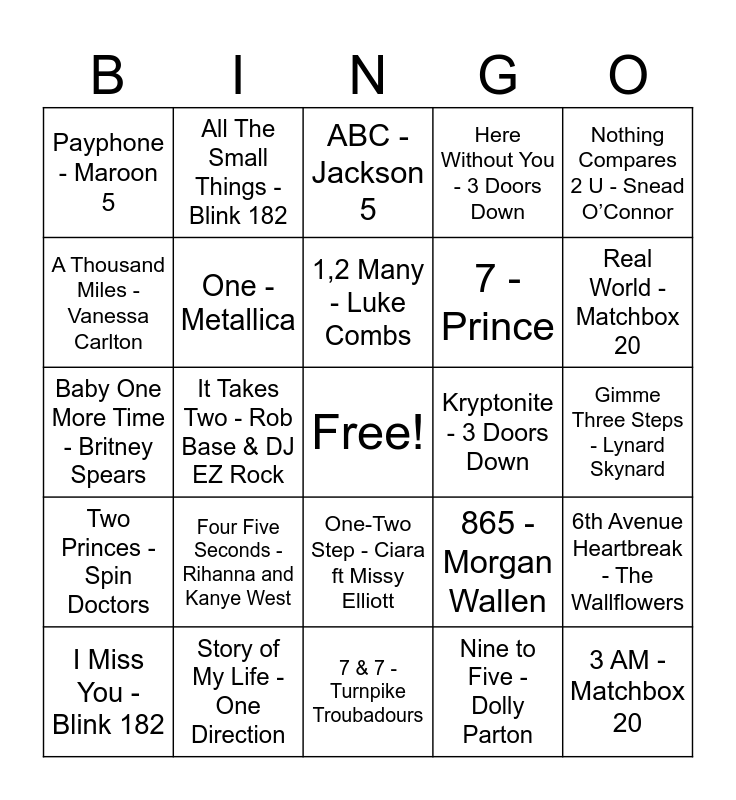 This bingo card has a free space and 41 words: One of them Girls - Lee Brice, Baby One More Time - Britney Spears, One Week - Barenaked Ladies, One - Metallica, Story of My Life - One Direction, One-Two Step - Ciara ft Missy Elliott, 1,2 Many - Luke Combs, Beautiful Day - U2, Nothing Compares 2 U - Snead O’Connor, Two Princes - Spin Doctors, It Takes Two - Rob Base & DJ EZ Rock, Here Without You - 3 Doors Down, 3 AM - Matchbox 20, Gimme Three Steps - Lynard Skynard, Kryptonite - 3 Doors Down, Four Five Seconds - Rihanna and Kanye West, Mambo #5 - Lou Bega, Payphone - Maroon 5, Animals - Maroon 5, ABC - Jackson 5, 6th Avenue Heartbreak - The Wallflowers, Six Feet Apart - Luke Combs, 7 & 7 - Turnpike Troubadours, 7 - Prince, Seven Nation Army - White Stripes, 7 Summers - Morgan Wallen, Nine to Five - Dolly Parton, Edge of Seventeen - Stevie Nicks, Real World - Matchbox 20, In Da Club - 50 Cent, Summer of ‘69 - Bryan Adams, All The Small Things - Blink 182, I Miss You - Blink 182, I’m Gonna Be (500 Miles) - The Proclaimers, 865 - Morgan Wallen, A Thousand Miles - Vanessa Carlton, 1979 - Smashing Pumpkins, 1985 - Bowling for Soup, 1999 - Prince, If I had $1,000,000 - Barenaked Ladies and 8675309/Jenny - Tommy Tutone.