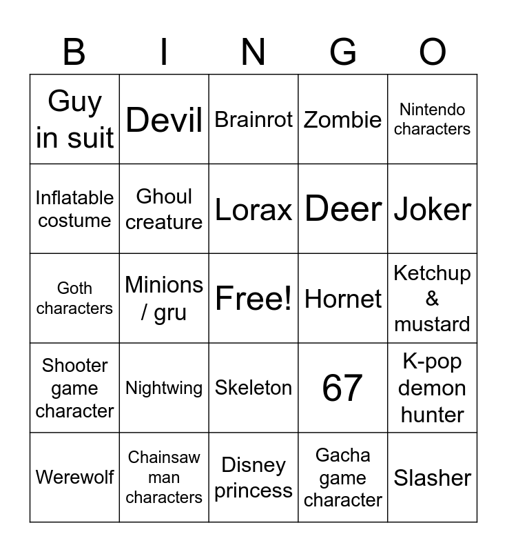 This bingo card has a free space and 24 words: Nightwing, Chainsaw man characters, Lorax, Werewolf, Nintendo characters, Guy in suit, Inflatable costume, Devil, Hornet, Skeleton, Deer, Goth characters, 67, K-pop demon hunter, Ghoul creature, Gacha game character, Ketchup & mustard, Brainrot, Joker, Minions / gru, Slasher, Shooter game character, Zombie and Disney princess.