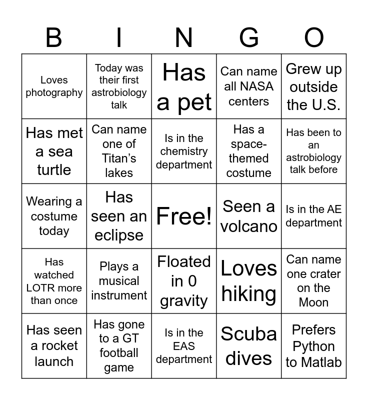 This bingo card has a free space and 26 words: Floated in 0 gravity, Scuba dives, Is in the chemistry department, Has gone to a GT football game, Grew up outside the U.S., Loves photography, Has met a sea turtle, Today was their first astrobiology talk, Is in the AE department, Loves hiking, Has a space-themed costume, Wearing a costume today, Can name one crater on the Moon, Has seen a rocket launch, Has seen an eclipse, Speaks 3+ languages, Can name all NASA centers, Has watched LOTR more than once, Has a pet, Prefers Python to Matlab, Has been to an astrobiology talk before, Is in the EAS department, Seen a volcano, Plays a musical instrument, Can name one of Titan’s lakes and Has done research with NASA.
