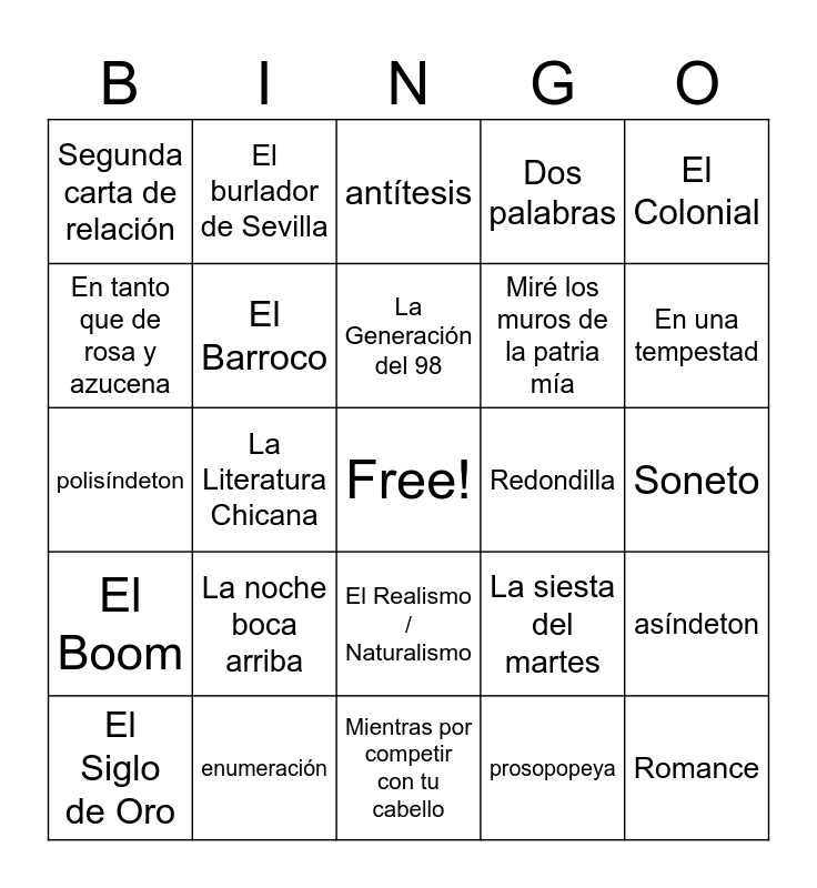 This bingo card has a free space and 39 words: el Romanticismo, la Edad Media, El Renacimiento, El Barroco, El Siglo de Oro, El Realismo / Naturalismo, La Generación del 98, El Vanguardismo, El Colonial, El Boom, La Literatura Chicana, Dos palabras, Romance, Soneto, Redondilla, La noche boca arriba, Don Quijote, Segunda carta de relación, Hombres necios que acusáis, La siesta del martes, En tanto que de rosa y azucena, Mientras por competir con tu cabello, Miré los muros de la patria mía, En una tempestad, Visión de los vencidos, He andado muchos caminos, Walking around, Las medias rojas, No oyes ladrar los perros, El burlador de Sevilla, Mi caballo mago, hipérbaton, antítesis, enumeración, prosopopeya, intertextualidad, asíndeton, polisíndeton and aliteración.