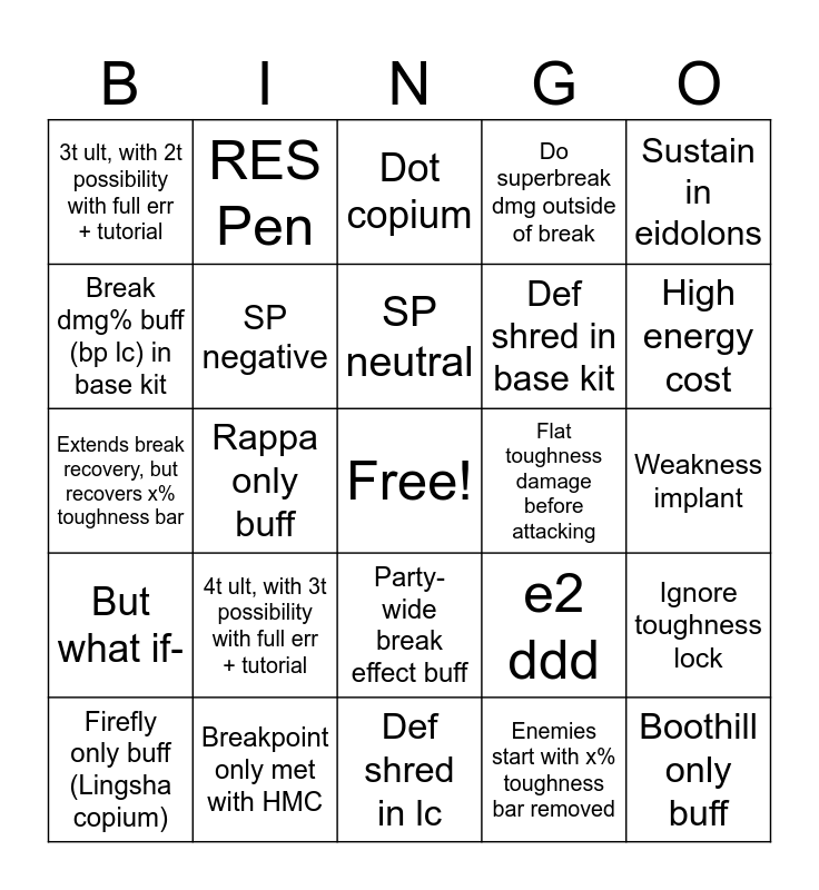 This bingo card has a free space and 27 words: e2 ddd, 50% weakness break efficiency in base kit, Def shred in base kit, Def shred in lc, Break dmg% buff (bp lc) in base kit, Dot copium, RES Pen, But what if-, Flat toughness damage before attacking, Ignore toughness lock, Extends break recovery, but recovers x% toughness bar, Do superbreak dmg outside of break, Firefly only buff (Lingsha copium), Breakpoint only met with HMC, High energy cost, SP positive, SP negative, SP neutral, 4t ult, with 3t possibility with full err + tutorial, 3t ult, with 2t possibility with full err + tutorial, Weakness implant, Enemies start with x% toughness bar removed, Rappa only buff, Boothill only buff, Party-wide break effect buff, Sustain in eidolons and Varying wbe buff based on target count.