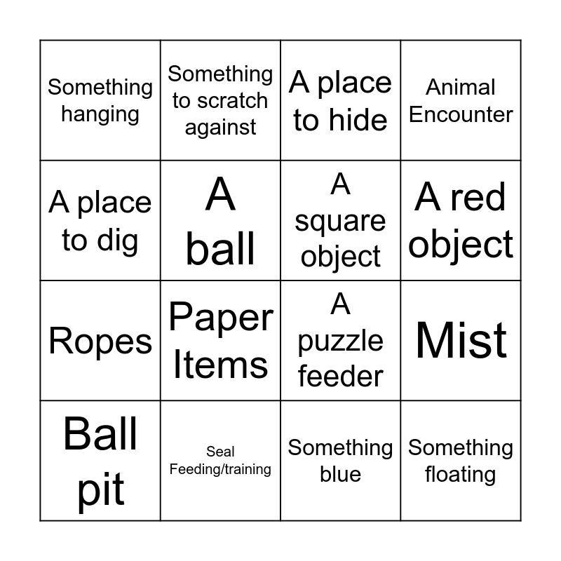 This bingo card has 16 words: Ball pit, Seal Feeding/training, A place to hide, Animal Encounter, A place to dig, Something to scratch against, A puzzle feeder, Mist, Something hanging, A ball, Something blue, A red object, Ropes, Paper Items, A square object and Something floating.