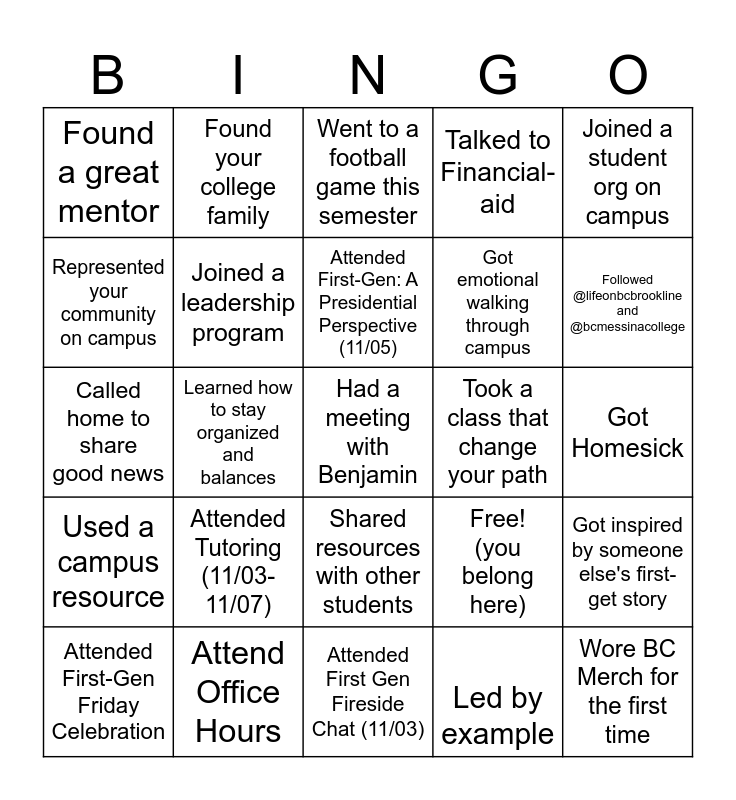 This bingo card has 25 words: Attended Tutoring (11/03-11/07), Attended First Gen Fireside Chat (11/03), Attended First-Gen: A Presidential Perspective (11/05), Attended First-Gen Friday Celebration, Joined a student org on campus, Found a great mentor, Represented your community on campus, Found your college family, Took a class that change your path, Shared resources with other students, Got emotional walking through campus, Called home to share good news, Free! (you belong here), Got inspired by someone else's first-get story, Joined a leadership program, Wore BC Merch for the first time, Got Homesick, Went to a football game this semester, Followed @lifeonbcbrookline and @bcmessinacollege, Learned how to stay organized and balances, Had a meeting with Benjamin, Attend Office Hours, Used a campus resource, Talked to Financial-aid and Led by example.