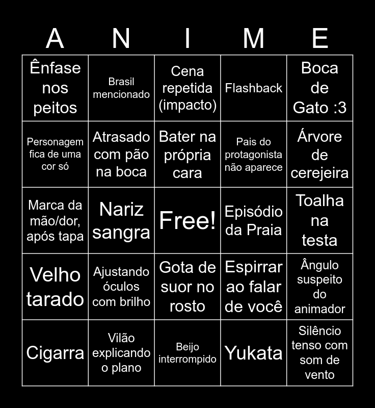 This bingo card has a free space and 29 words: Cigarra, Sino da escola (todos iguais), Nariz sangra, Morrinho de grama, Ênfase nos peitos, Cena repetida (impacto), Atrasado com pão na boca, Ajustando óculos com brilho, Episódio da Praia, Vilão explicando o plano, Toalha na testa, Silêncio tenso com som de vento, Beijo interrompido, Yukata, Árvore de cerejeira, Inglês "japonesdo", Gota de suor no rosto, Velho tarado, Boca de Gato :3, Marca da mão/dor, após tapa, Espirrar ao falar de você, Cabeça baixa+olhos sumindo+testa escura+punhos cerrados, Pais do protagonista não aparece, Personagem fica de uma cor só, Flashback, Brasil mencionado, Ângulo suspeito do animador, Bater na própria cara and Uma lágrima escorre.