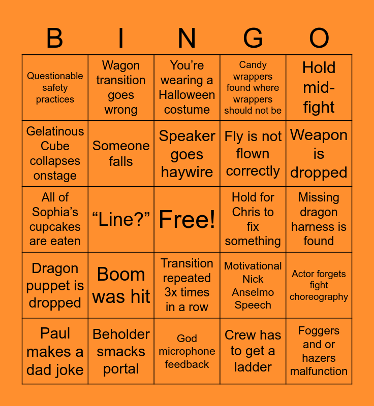 This bingo card has a free space and 24 words: Boom was hit, Beholder smacks portal, Speaker goes haywire, Paul makes a dad joke, Hold mid-fight, Questionable safety practices, Gelatinous Cube collapses onstage, Wagon transition goes wrong, Hold for Chris to fix something, Transition repeated 3x times in a row, Fly is not flown correctly, All of Sophia’s cupcakes are eaten, Motivational Nick Anselmo Speech, Actor forgets fight choreography, Someone falls, Crew has to get a ladder, Missing dragon harness is found, You’re wearing a Halloween costume, Weapon is dropped, “Line?”, Foggers and or hazers malfunction, Dragon puppet is dropped, Candy wrappers found where wrappers should not be and God microphone feedback.