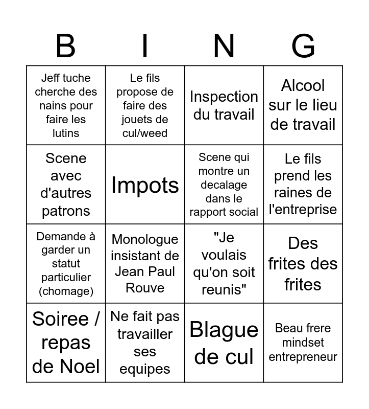 This bingo card has 16 words: Ne fait pas travailler ses equipes, Des frites des frites, Inspection du travail, Jeff tuche cherche des nains pour faire les lutins, Demande à garder un statut particulier (chomage), Le fils propose de faire des jouets de cul/weed, "Je voulais qu'on soit reunis", Blague de cul, Scene avec d'autres patrons, Impots, Soiree / repas de Noel, Alcool sur le lieu de travail, Monologue insistant de Jean Paul Rouve, Le fils prend les raines de l'entreprise, Scene qui montre un decalage dans le rapport social and Beau frere mindset entrepreneur.