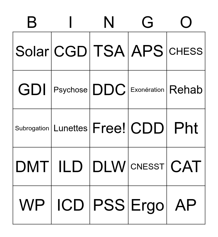 This bingo card has a free space and 24 words: ILD, ICD, DDC, WP, CHESS, Solar, GDI, CGD, CDD, DLW, Exonération, Subrogation, CNESST, CAT, Psychose, Ergo, Pht, TSA, Rehab, Lunettes, AP, DMT, APS and PSS.