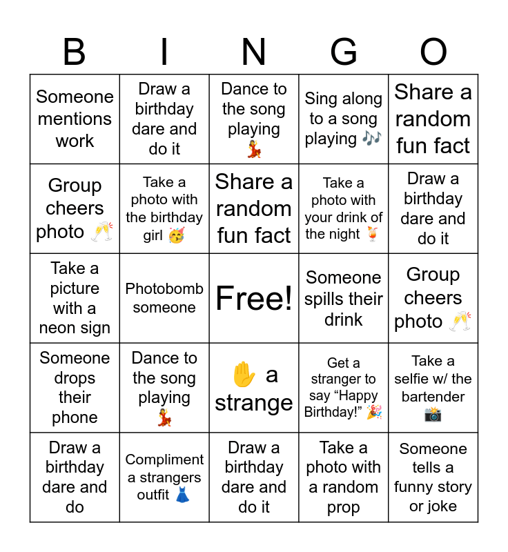 This bingo card has a free space and 25 words: Dance to the song playing 💃, Draw a birthday dare and do it, Share a random fun fact, Draw a birthday dare and do, Share a random fun fact, Someone mentions work, Group cheers photo 🥂, Draw a birthday dare and do it, Someone spills their drink, ✋ a strange, Take a photo with your drink of the night 🍹, Take a picture with a neon sign, Get a stranger to say “Happy Birthday!” 🎉, Take a selfie w/ the bartender 📸, Take a photo with the birthday girl 🥳, Someone mentions work, Group cheers photo 🥂, Dance to the song playing 💃, Draw a birthday dare and do it, Photobomb someone, Someone tells a funny story or joke, Compliment a strangers outfit 👗, Someone drops their phone, Sing along to a song playing 🎶 and Take a photo with a random prop.