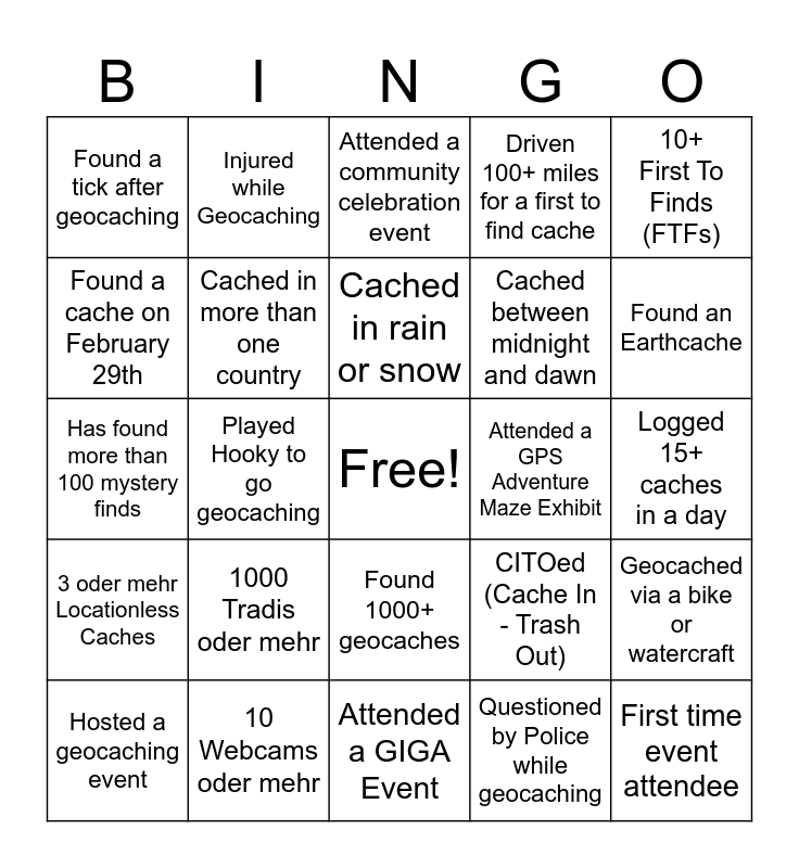 This bingo card has a free space and 24 words: 1000 Tradis oder mehr, 10 Webcams oder mehr, Cached in rain or snow, Hosted a geocaching event, 10+ First To Finds (FTFs), Found a tick after geocaching, Found a cache on February 29th, Injured while Geocaching, Attended a GPS Adventure Maze Exhibit, Found 1000+ geocaches, Cached between midnight and dawn, Has found more than 100 mystery finds, CITOed (Cache In - Trash Out), Geocached via a bike or watercraft, Cached in more than one country, Questioned by Police while geocaching, Logged 15+ caches in a day, Attended a community celebration event, Found an Earthcache, Played Hooky to go geocaching, First time event attendee, 3 oder mehr Locationless Caches, Driven 100+ miles for a first to find cache and Attended a GIGA Event.