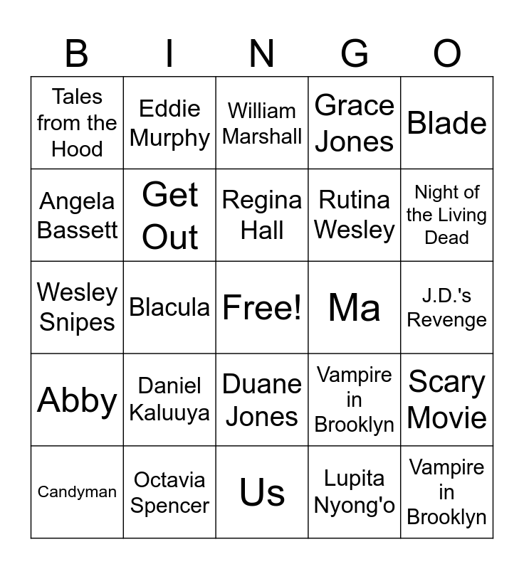 This bingo card has a free space and 29 words: Candyman, Tony Todd, Blacula, Queen Akasha, Tales from the Hood, William Marshall, Get Out, Daniel Kaluuya, Ma, Octavia Spencer, J.D.'s Revenge, Vampire in Brooklyn, Us, Lupita Nyong'o, Night of the Living Dead, Adelaide Wilson, Duane Jones, Abby, Blade, Wesley Snipes, Vampire in Brooklyn, Lovecraft Country, Rutina Wesley, Angela Bassett, Grace Jones, Eddie Murphy, Scary Movie, Regina Hall and Brenda Meeks.
