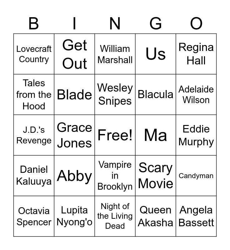 This bingo card has a free space and 28 words: Candyman, Tony Todd, Blacula, Queen Akasha, Tales from the Hood, William Marshall, Get Out, Daniel Kaluuya, Ma, Octavia Spencer, J.D.'s Revenge, Us, Lupita Nyong'o, Night of the Living Dead, Adelaide Wilson, Duane Jones, Abby, Blade, Wesley Snipes, Vampire in Brooklyn, Lovecraft Country, Rutina Wesley, Angela Bassett, Grace Jones, Eddie Murphy, Scary Movie, Regina Hall and Brenda Meeks.