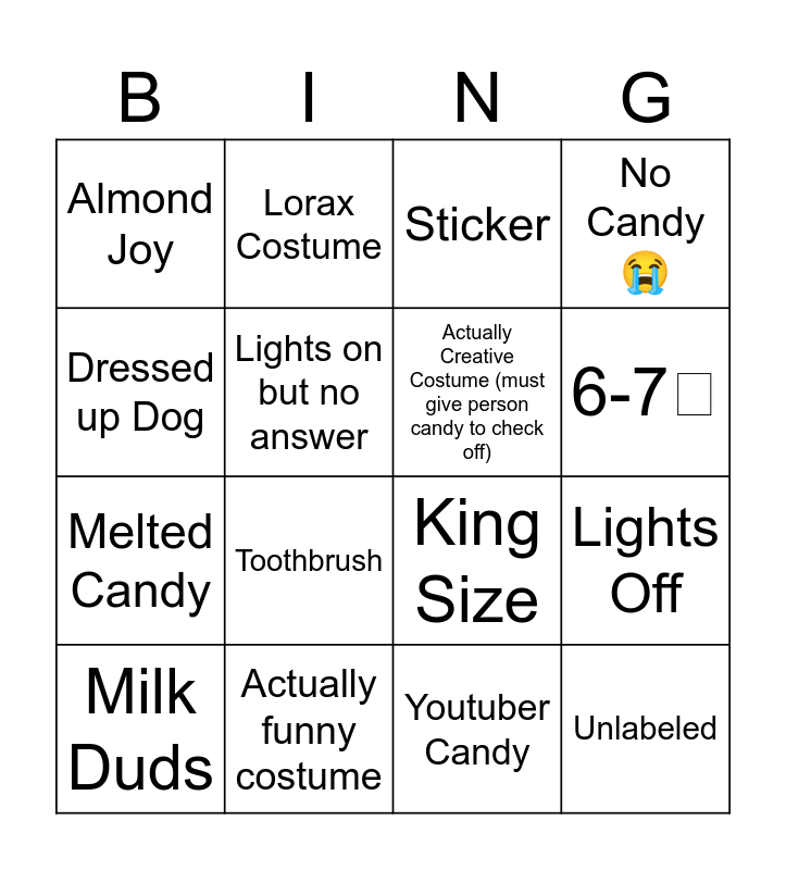This bingo card has 18 words: Toothbrush, Unlabeled, Sticker, Almond Joy, King Size, No Candy😭, Milk Duds, Lorax Costume, 6-7, Melted Candy, Youtuber Candy, Dressed up Dog, Lights Off, Lights on but no answer, Actually Creative Costume (must give person candy to check off), Terrible Jack-O-Lantern, Actually funny costume and More than 5 king size.