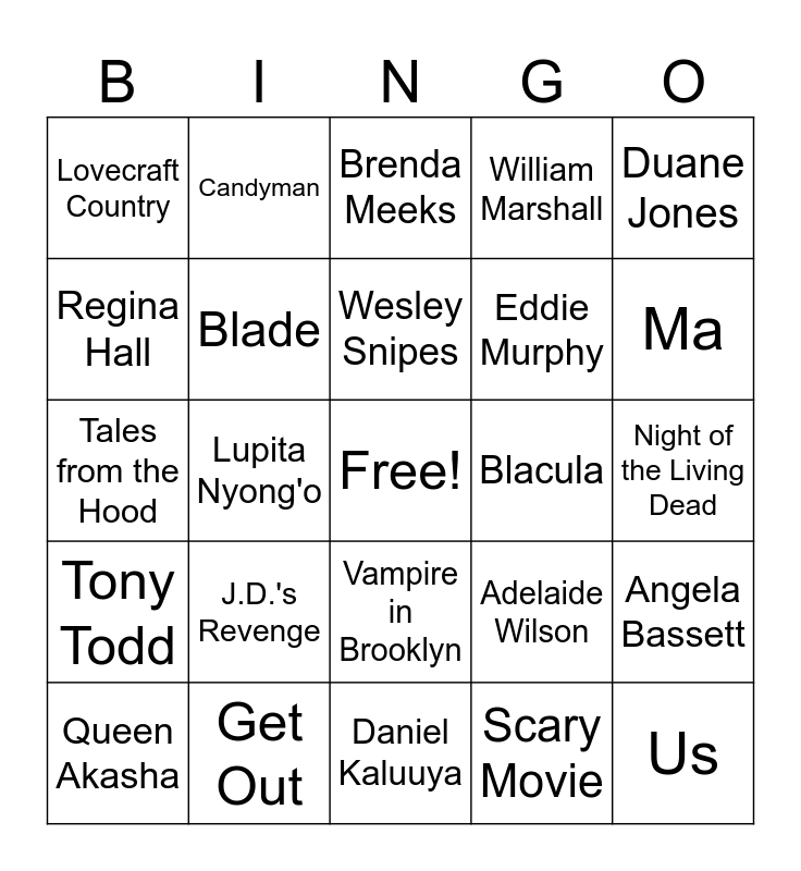 This bingo card has a free space and 28 words: Angela Bassett, Grace Jones, Eddie Murphy, Scary Movie, Regina Hall, Brenda Meeks, Candyman, Tony Todd, Blacula, Queen Akasha, Tales from the Hood, William Marshall, Get Out, Daniel Kaluuya, Ma, Octavia Spencer, J.D.'s Revenge, Blade, Wesley Snipes, Vampire in Brooklyn, Lovecraft Country, Rutina Wesley, Us, Lupita Nyong'o, Night of the Living Dead, Adelaide Wilson, Duane Jones and Abby.