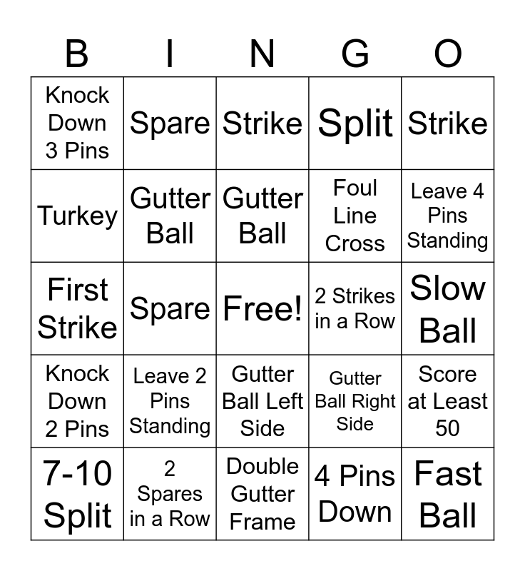 This bingo card has a free space and 24 words: Leave 2 Pins Standing, 2 Spares in a Row, Gutter Ball, 7-10 Split, Strike, Knock Down 3 Pins, Turkey, Spare, 2 Strikes in a Row, Gutter Ball Left Side, Foul Line Cross, First Strike, Gutter Ball Right Side, Score at Least 50, Gutter Ball, 4 Pins Down, Slow Ball, Strike, Leave 4 Pins Standing, Spare, Fast Ball, Knock Down 2 Pins, Split and Double Gutter Frame.