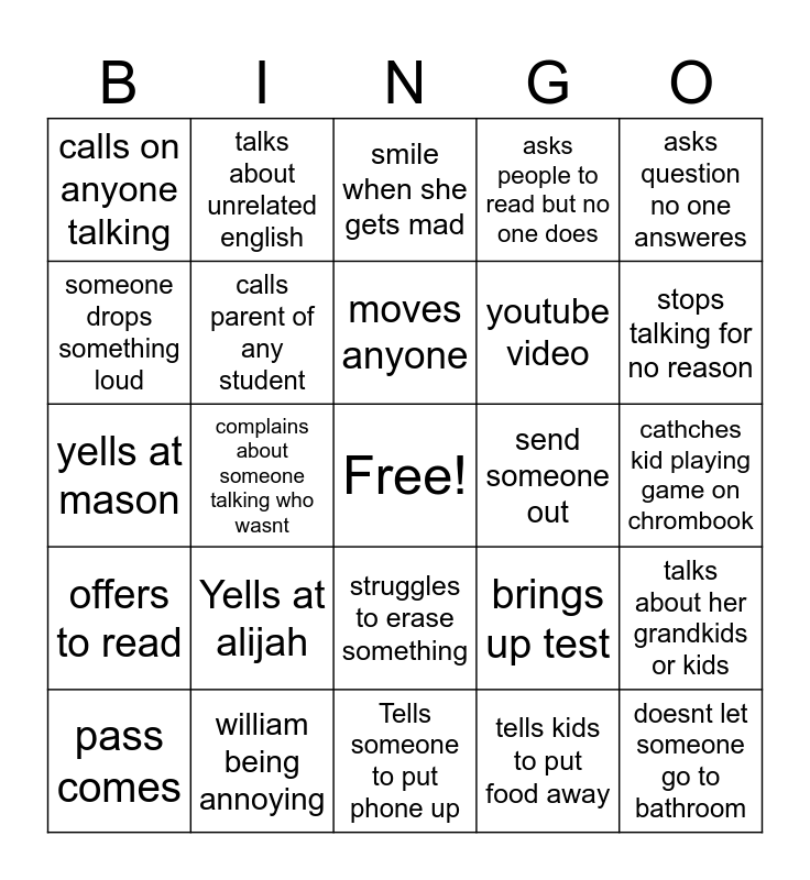 This bingo card has a free space and 25 words: Yells at alijah, Tells someone to put phone up, moves anyone, pass comes, asks question no one answeres, calls on anyone talking, someone drops something loud, talks about unrelated english, send someone out, struggles to erase something, youtube video, yells at mason, brings up test, talks about her grandkids or kids, calls parent of any student, calls us immature class, cathches kid playing game on chrombook, smile when she gets mad, stops talking for no reason, complains about someone talking who wasnt, doesnt let someone go to bathroom, william being annoying, offers to read, asks people to read but no one does and tells kids to put food away.