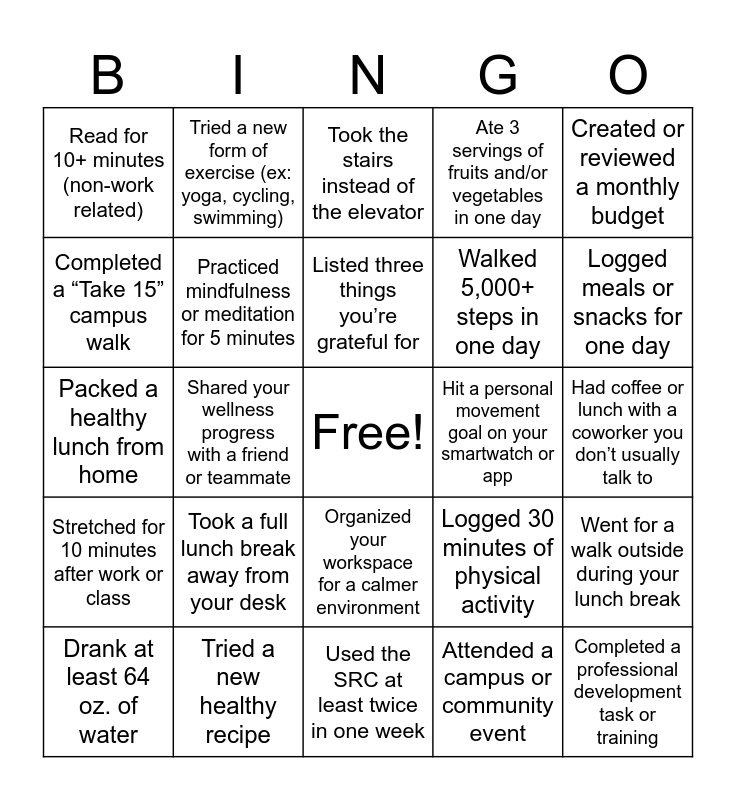 This bingo card has a free space and 27 words: Logged 30 minutes of physical activity, Attended a SouthFit group fitness class, Walked 5,000+ steps in one day, Used the SRC at least twice in one week, Completed a “Take 15” campus walk, Took the stairs instead of the elevator, Tried a new form of exercise (ex: yoga, cycling, swimming), Stretched for 10 minutes after work or class, Hit a personal movement goal on your smartwatch or app, Went for a walk outside during your lunch break, Packed a healthy lunch from home, Ate 3 servings of fruits and/or vegetables in one day, Drank at least 64 oz. of water, Tried a new healthy recipe, Logged meals or snacks for one day, Refilled a reusable water bottle three times in one day, Practiced mindfulness or meditation for 5 minutes, Listed three things you’re grateful for, Took a full lunch break away from your desk, Read for 10+ minutes (non-work related), Had coffee or lunch with a coworker you don’t usually talk to, Attended a campus or community event, Shared your wellness progress with a friend or teammate, Completed a professional development task or training, Organized your workspace for a calmer environment, Created or reviewed a monthly budget and Wrote down 1–2 professional goals for next month.