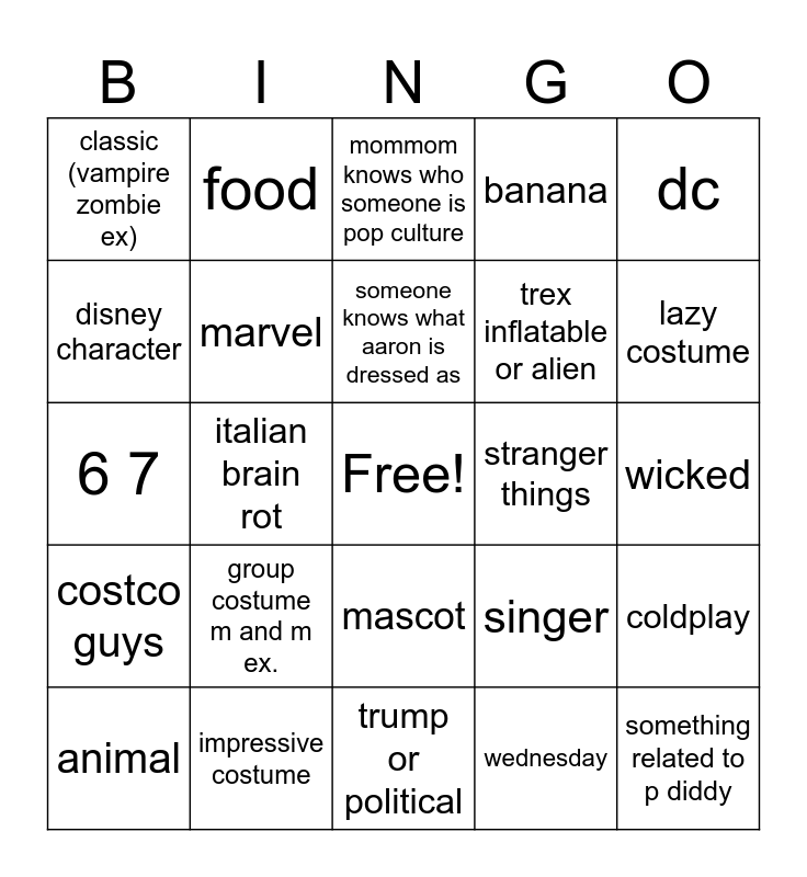 This bingo card has a free space and 33 words: K-pop demon hunter, labubu, italian brain rot, fortnite, costco guys, marvel, dc, animal, food, dog in a costume, someone knows what aaron is dressed as, mommom knows who someone is pop culture, scream/ myers ex., squid game, stranger things, lazy costume, impressive costume, 6 7, group costume m and m ex., singer, mascot, happy gilmore, classic (vampire zombie ex), wicked, trump or political, something related to p diddy, banana, trex inflatable or alien, disney character, coldplay, dune, wednesday and Aaron doesn’t know who it is.