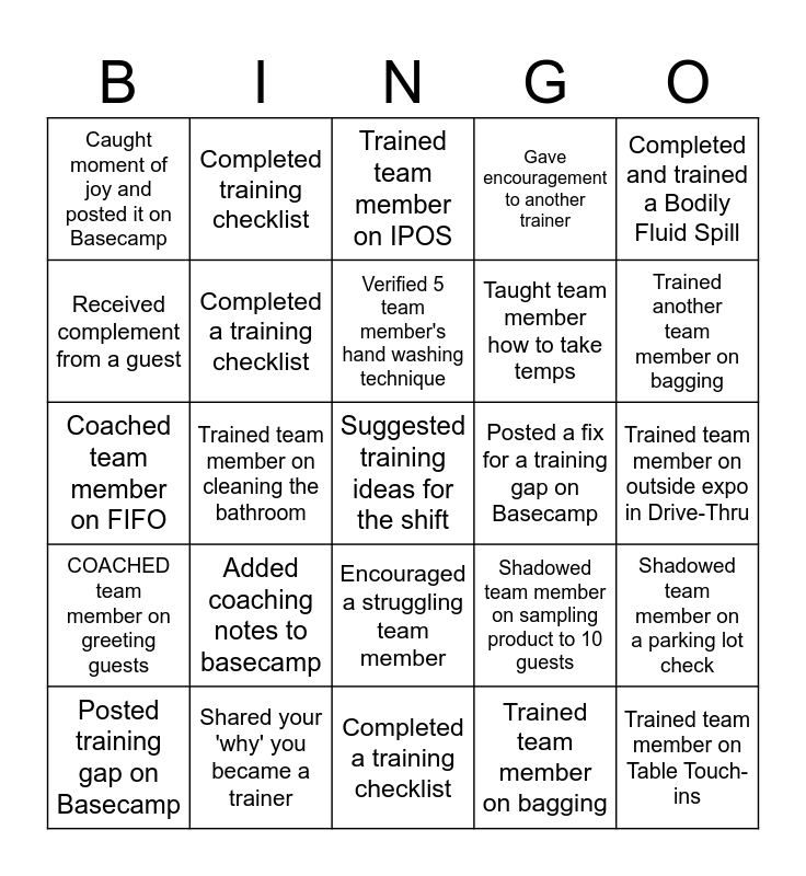 This bingo card has a free space and 24 words: Added coaching notes to basecamp, Shared your 'why' you became a trainer, Verified 5 team member's hand washing technique, Posted training gap on Basecamp, Completed and trained a Bodily Fluid Spill, Caught moment of joy and posted it on Basecamp, Received complement from a guest, Completed training checklist, Posted a fix for a training gap on Basecamp, Encouraged a struggling team member, Taught team member how to take temps, Coached team member on FIFO, Shadowed team member on sampling product to 10 guests, Shadowed team member on a parking lot check, Completed a training checklist, Trained team member on bagging, Trained team member on outside expo in Drive-Thru, Trained team member on IPOS, Trained another team member on bagging, Trained team member on cleaning the bathroom, Trained team member on Table Touch-ins, COACHED team member on greeting guests, Gave encouragement to another trainer and Completed a training checklist.