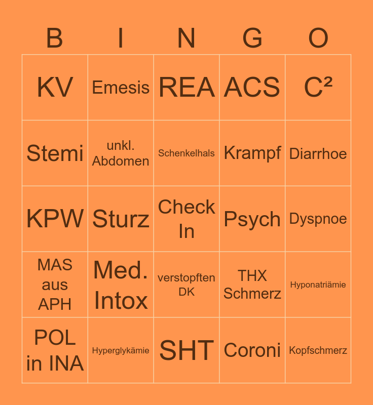 This bingo card has a free space and 24 words: Med. Intox, Hyperglykämie, Schenkelhals, POL in INA, C², KV, Stemi, Emesis, Psych, verstopften DK, Krampf, KPW, THX Schmerz, Hyponatriämie, unkl. Abdomen, Coroni, Dyspnoe, REA, Diarrhoe, Sturz, Kopfschmerz, MAS aus APH, ACS and SHT.
