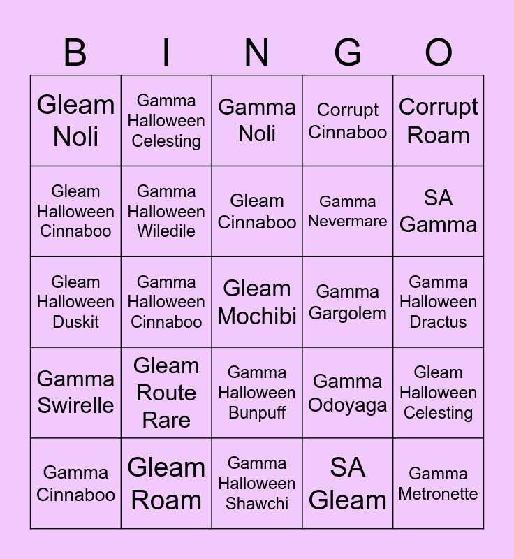 This bingo card has a free space and 24 words: Gleam Route Rare, Gleam Roam, Gleam Cinnaboo, Gamma Cinnaboo, Corrupt Roam, Gleam Noli, Gleam Halloween Cinnaboo, Gamma Halloween Celesting, Gamma Gargolem, Gamma Halloween Bunpuff, Gamma Nevermare, Gleam Halloween Duskit, Gamma Odoyaga, Gleam Halloween Celesting, Gamma Halloween Wiledile, SA Gleam, Gamma Halloween Dractus, Gamma Noli, SA Gamma, Gamma Halloween Cinnaboo, Gamma Metronette, Gamma Swirelle, Corrupt Cinnaboo and Gamma Halloween Shawchi.