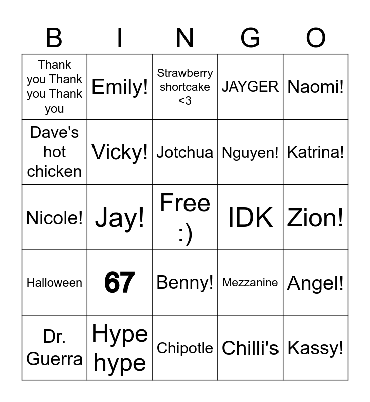 This bingo card has a free space and 24 words: 67, Hype hype, Jotchua, Dr. Guerra, Naomi!, Thank you Thank you Thank you, Dave's hot chicken, Emily!, IDK, Benny!, Nguyen!, Nicole!, Mezzanine, Angel!, Vicky!, Chilli's, Zion!, Strawberry shortcake <3, Katrina!, Jay!, Kassy!, Halloween, JAYGER and Chipotle.