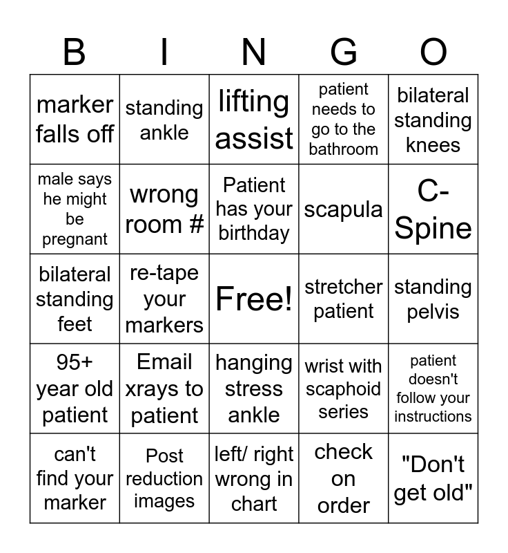 This bingo card has a free space and 24 words: Email xrays to patient, Post reduction images, Patient has your birthday, can't find your marker, bilateral standing knees, marker falls off, male says he might be pregnant, standing ankle, stretcher patient, hanging stress ankle, scapula, bilateral standing feet, wrist with scaphoid series, patient doesn't follow your instructions, wrong room #, check on order, standing pelvis, lifting assist, C-Spine, re-tape your markers, "Don't get old", 95+ year old patient, patient needs to go to the bathroom and left/ right wrong in chart.