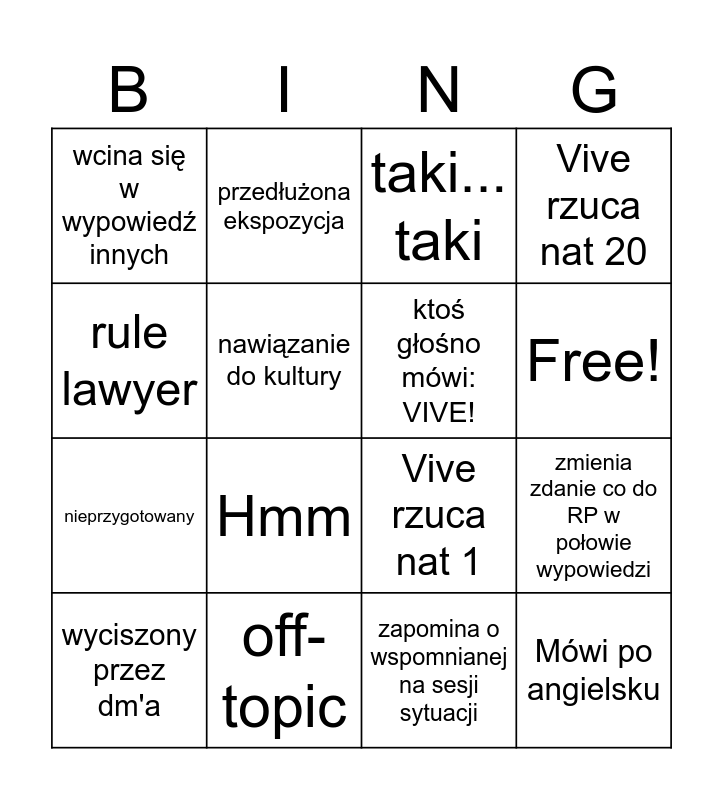 This bingo card has 18 words: Hmm, Mówi po angielsku, taki... taki, wcina się w wypowiedź innych, Vive rzuca nat 1, Vive rzuca nat 20, wyciszony przez dm'a, przedłużona ekspozycja, Free!, nieprzygotowany, zapomina o wspomnianej na sesji sytuacji, rule lawyer, zmienia zdanie co do RP w połowie wypowiedzi, nawiązanie do kultury, ktoś głośno mówi: VIVE!, zw, off-topic and Yyyyyy....