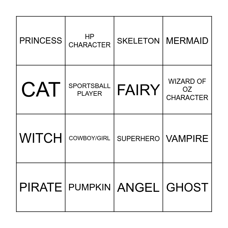 This bingo card has 16 words: PUMPKIN, VAMPIRE, SKELETON, PRINCESS, WITCH, HP CHARACTER, SUPERHERO, ANGEL, CAT, SPORTSBALL PLAYER, PIRATE, MERMAID, COWBOY/GIRL, WIZARD OF OZ CHARACTER, FAIRY and GHOST.