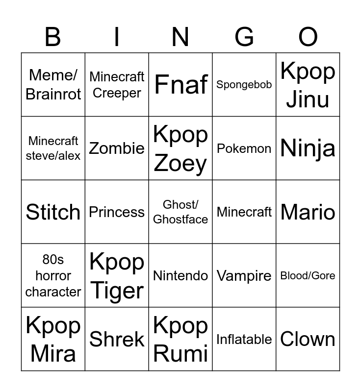 This bingo card has 25 words: Kpop Tiger, Kpop Rumi, Kpop Zoey, Kpop Mira, Kpop Jinu, Meme/ Brainrot, Minecraft steve/alex, Minecraft Creeper, Minecraft, Nintendo, Pokemon, Stitch, Vampire, Blood/Gore, Zombie, Clown, Mario, Fnaf, Ninja, Princess, Ghost/ Ghostface, Shrek, 80s horror character, Spongebob and Inflatable.