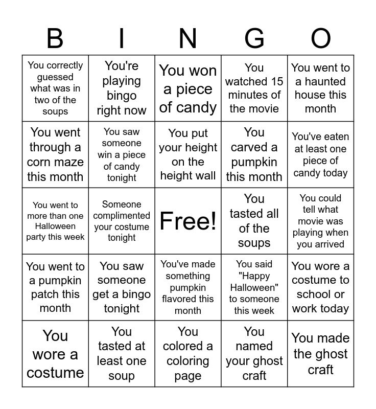 This bingo card has a free space and 29 words: You wore a costume, You complimented someone's costume tonight, Someone complimented your costume tonight, You drew a pumpkin (and didn't peek!), You correctly guessed what was in two of the soups, You won a piece of candy, You saw someone win a piece of candy tonight, You saw someone get a bingo tonight, You tasted all of the soups, You tasted at least one soup, You could tell what movie was playing when you arrived, You made the ghost craft, You colored a coloring page, You named your ghost craft, You've eaten at least one piece of candy today, You've eaten something pumpkin flavored this month, You've made something pumpkin flavored this month, You went to a pumpkin patch this month, You went to a haunted house this month, You went to more than one Halloween party this week, You said "Happy Halloween" to someone this week, You watched a spooky movie this month, You carved a pumpkin this month, You went through a corn maze this month, You watched 15 minutes of the movie, You're playing bingo right now, You wore a costume to school or work today, You put your height on the height wall and You listened to Thriller sometime this week.