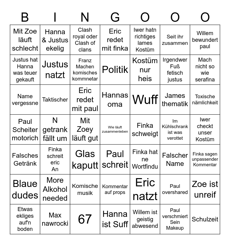 This bingo card has a free space and 48 words: Eric natzt, Irgendwer Fuß fetisch justus, Hanna ist Suff, N getrank fällt um, Eric redet mit paul, Iwer checkt unser Kostüm, Hanna & Justus ekelig, Max nawrocki, Seit ihr zusammen, Paul schreit, Willem bewundert paul, Eric redet mit finka, James thematik, Wuff, Blaue dudes, Im Kühlschrank ist was verottet, Justus hat Hanna was teuer gekauft, Mach nicht so wie serafina, Paul overshared, Iwer hatn richtiges lames Kostüm, Kostüm nur heis, Mit Zoey läuft gut, Mit Zoe läuft schlecht, Justus natzt, Zoe ist unreif, Franz Machen komisches kommnetar, Toxische nämlichkeit, Etwas ekliges auf'n boden, Hannas oma, Taktischer, Paul verschmiert Sein Makeup, Finka schweigt, Finka sagen unpassender Kommentar, More Alkohol needed, Paul Scheiter motorich, Finka hat ne Wortfindu, Falscher Name, Name vergessne, Glas kaputt, Komische musik, Falsches Getränk, Schulzeit, Clash royal oder Clash of clans, 67, Politik, Kommentar auf props, Finka schreit eric An and Willem ist geistig abwesend.