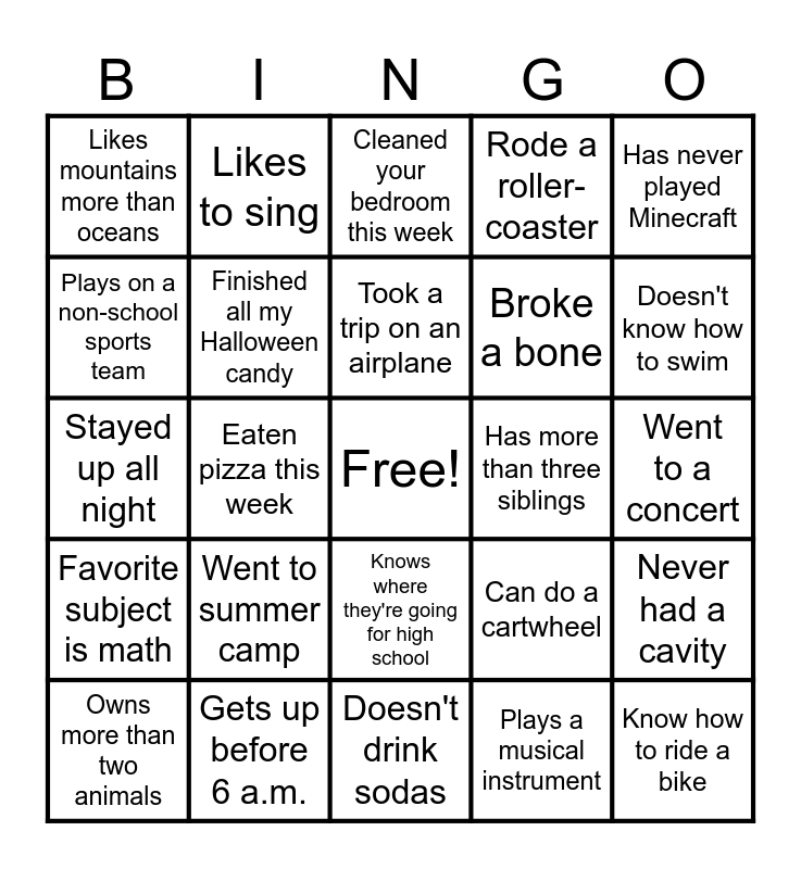 This bingo card has a free space and 24 words: Went to summer camp, Gets up before 6 a.m., Took a trip on an airplane, Owns more than two animals, Has never played Minecraft, Likes mountains more than oceans, Plays on a non-school sports team, Likes to sing, Has more than three siblings, Knows where they're going for high school, Broke a bone, Stayed up all night, Can do a cartwheel, Never had a cavity, Finished all my Halloween candy, Plays a musical instrument, Went to a concert, Cleaned your bedroom this week, Doesn't know how to swim, Eaten pizza this week, Know how to ride a bike, Favorite subject is math, Rode a roller-coaster and Doesn't drink sodas.