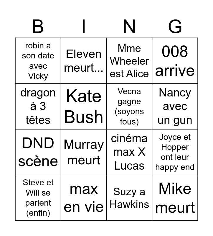 This bingo card has 16 words: max en vie, Joyce et Hopper ont leur happy end, Mme Wheeler est Alice, robin a son date avec Vicky, DND scène, Eleven meurt..., cinéma max X Lucas, Suzy a Hawkins, dragon à 3 têtes, Kate Bush, Steve et Will se parlent (enfin), 008 arrive, Murray meurt, Nancy avec un gun, Vecna gagne (soyons fous) and Mike meurt.