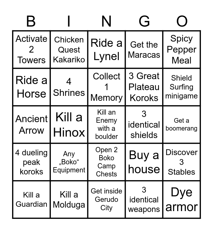 This bingo card has 25 words: Any „Boko“ Equipment, Get inside Gerudo City, Collect 1 Memory, Kill a Guardian, Spicy Pepper Meal, Activate 2 Towers, Ride a Horse, Chicken Quest Kakariko, 3 identical shields, Open 2 Boko Camp Chests, 3 Great Plateau Koroks, Ancient Arrow, Buy a house, Discover 3 Stables, 4 Shrines, Dye armor, Get a boomerang, Ride a Lynel, Shield Surfing minigame, Kill a Hinox, Kill an Enemy with a boulder, Kill a Molduga, 4 dueling peak koroks, Get the Maracas and 3 identical weapons.