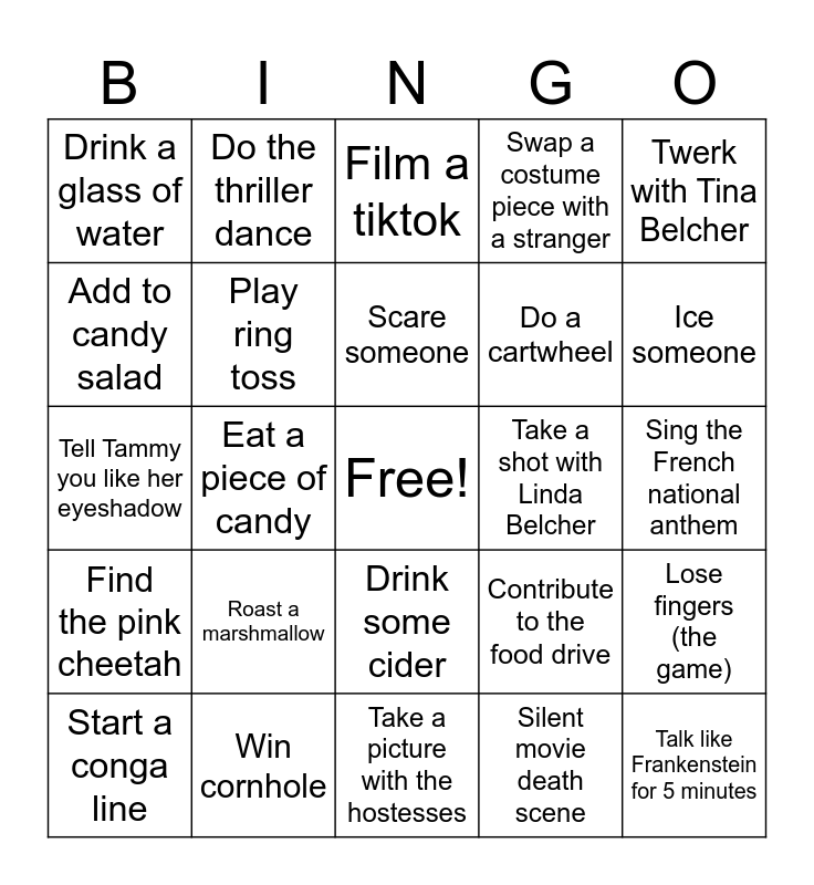 This bingo card has a free space and 27 words: Contribute to the food drive, Win beer pong, Do a cartwheel, Take a picture with the hostesses, Add to candy salad, Film a tiktok, Do the thriller dance, Find the pink cheetah, Take a shot with Linda Belcher, Lose fingers (the game), Tell Tammy you like her eyeshadow, Swap a costume piece with a stranger, Start a conga line, Win cornhole, Ice someone, Eat a savory snack, Play ring toss, Scare someone, Roast a marshmallow, Drink a glass of water, Sing the French national anthem, Silent movie death scene, Eat a piece of candy, Talk like Frankenstein for 5 minutes, Drink some cider, Twerk with Tina Belcher and Win Jenga.