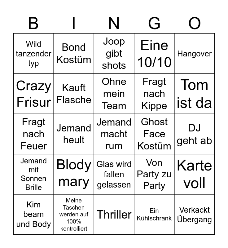 This bingo card has 25 words: Blody mary, Thriller, Ohne mein Team, Kim beam und Body, Hangover, Wild tanzender typ, Crazy Frisur, Bond Kostüm, Ghost Face Kostüm, Glas wird fallen gelassen, Fragt nach Kippe, Fragt nach Feuer, Von Party zu Party, Karte voll, Kauft Flasche, Verkackt Übergang, DJ geht ab, Joop gibt shots, Tom ist da, Jemand heult, Jemand macht rum, Meine Taschen werden auf 100% kontrolliert, Jemand mit Sonnen Brille, Eine 10/10 and Ein Kühlschrank.