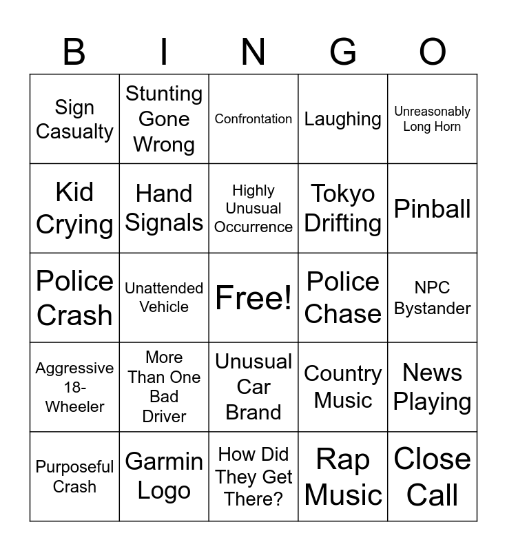 This bingo card has a free space and 48 words: Items Thrown at Cat, Close Call, Dashboard Items, How Did They Get There?, More Than One Bad Driver, Vandalism by Car, Stunting Gone Wrong, Pulling Over to Help, Kid Crying, Wrong way!, Hand Signals, Laughing, News Playing, Country Music, Animal, Parking Lot Crash, Highly Unusual Occurrence, Police Chase, Animals in Unusual Places, Unreasonably Long Horn, Unattended Vehicle, Rap Music, Sign Casualty, Tokyo Drifting, Jumpscare, Pinball, Purposeful Crash, Unusual Car Color, Unusual Car Brand, Aggressive 18-Wheeler, Pole Casualty, Flipped Car, A Bad Driver Never Misses Their Turn, Man Cussing, Garmin Logo, Karen, Stuck, NPC Bystander, Ohio Roads, Can Opener, Backing Into Vehicle, Doorbell Cam, Confrontation, Accent, Police Crash, Nobody's Fault, Secret Third Lane and Unusually High Speed for Current Situation.
