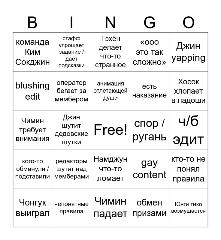 This bingo card has a free space and 24 words: редакторы шутят над мемберами, непонятные правила, анимация отлетающей души, Чонгук выиграл, Джин yapping, команда Ким Сокджин, blushing edit, стафф упрощает задание / даёт подсказки, спор / ругань, Намджун что-то ломает, есть наказание, Чимин требует внимания, gay content, кто-то не понял правила, оператор бегает за мембером, обмен призами, ч/б эдит, Тэхён делает что-то странное, Хосок хлопает в ладоши, Джин шутит дедовские шутки, Юнги тихо возмущается, кого-то обманули / подставили, «ооо это так сложно» and Чимин падает.