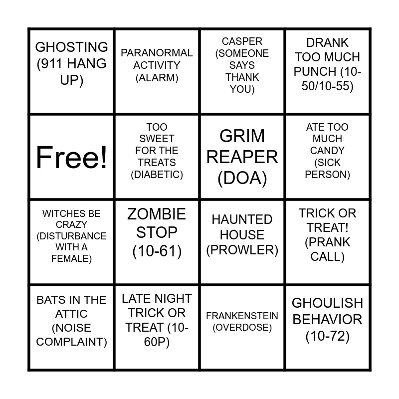 This bingo card has 16 words: LATE NIGHT TRICK OR TREAT (10-60P), TRICK OR TREAT! (PRANK CALL), CASPER (SOMEONE SAYS THANK YOU), GHOSTING (911 HANG UP), WITCHES BE CRAZY (DISTURBANCE WITH A FEMALE), PARANORMAL ACTIVITY (ALARM), HAUNTED HOUSE (PROWLER), FRANKENSTEIN (OVERDOSE), Free!, TOO SWEET FOR THE TREATS (DIABETIC), BATS IN THE ATTIC (NOISE COMPLAINT), DRANK TOO MUCH PUNCH (10-50/10-55), ZOMBIE STOP (10-61), ATE TOO MUCH CANDY (SICK PERSON), GRIM REAPER (DOA) and GHOULISH BEHAVIOR (10-72).