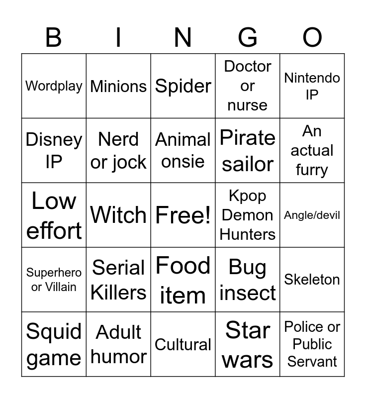 This bingo card has a free space and 24 words: Serial Killers, Adult humor, Animal onsie, Squid game, Nintendo IP, Wordplay, Disney IP, Minions, Kpop Demon Hunters, Food item, Pirate sailor, Low effort, Bug insect, Skeleton, Nerd or jock, Star wars, Angle/devil, Spider, An actual furry, Witch, Police or Public Servant, Superhero or Villain, Doctor or nurse and Cultural.