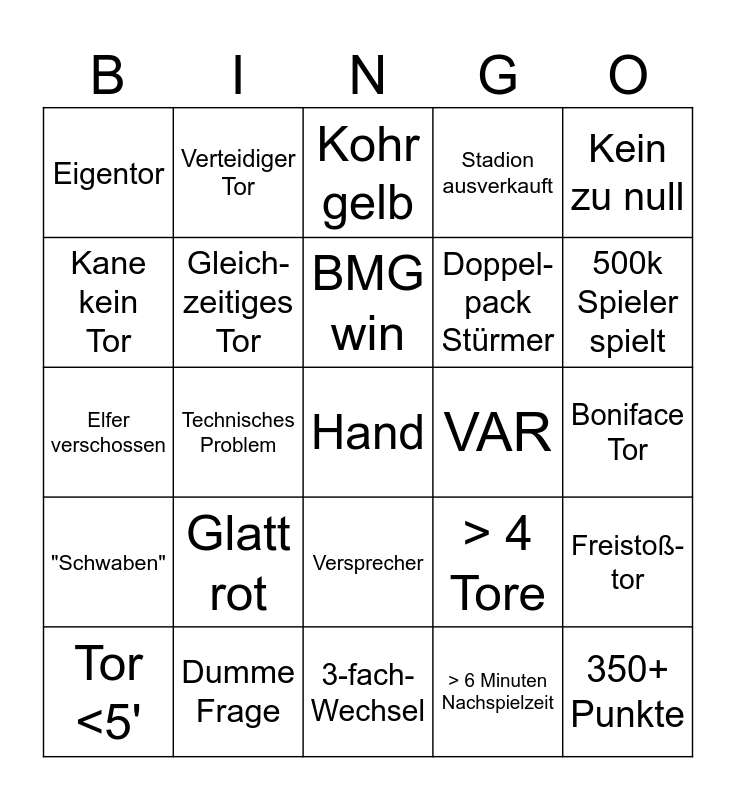This bingo card has 25 words: Glatt rot, 3-fach-Wechsel, BMG win, Tor <5', Kein zu null, Eigentor, Kane kein Tor, Verteidiger Tor, VAR, Versprecher, Doppel-pack Stürmer, Elfer verschossen, > 4 Tore, Freistoß-tor, Gleich-zeitiges Tor, 350+ Punkte, Boniface Tor, Kohr gelb, 500k Spieler spielt, Technisches Problem, Hand, Dumme Frage, "Schwaben", Stadion ausverkauft and > 6 Minuten Nachspielzeit.
